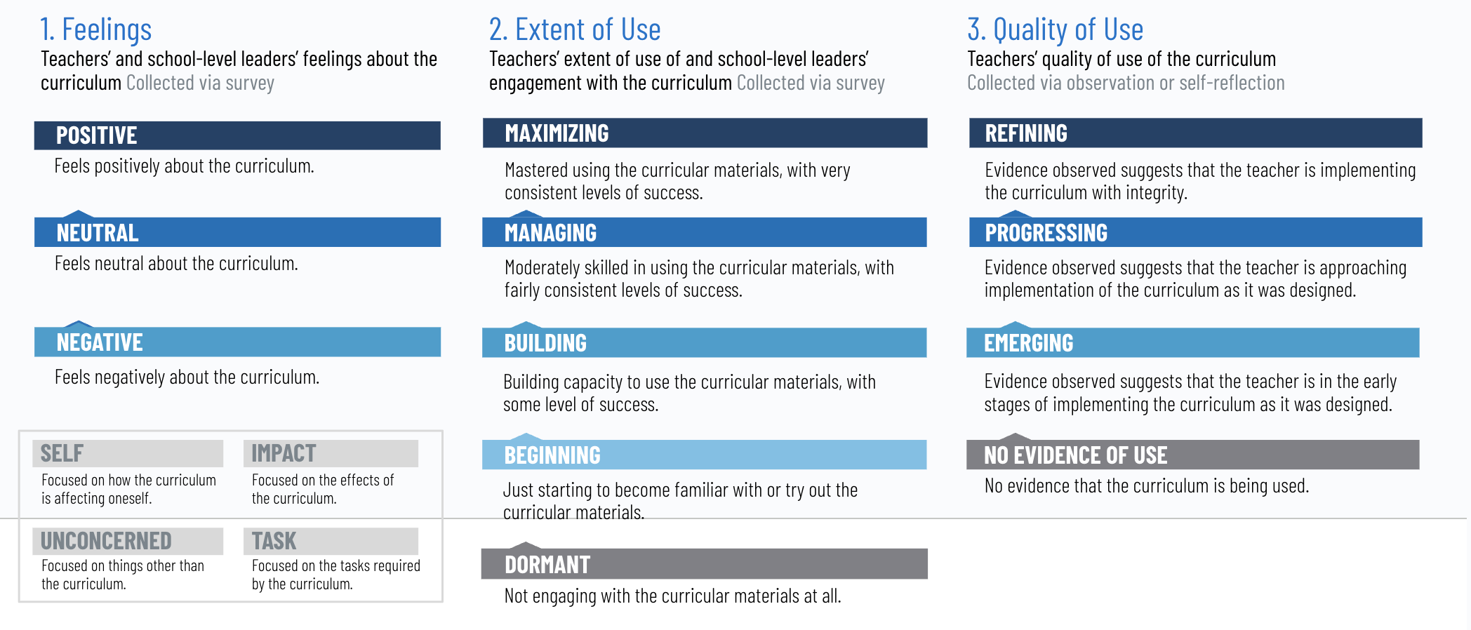 Curriculum-specific tools that measure implementation quality along a progression.